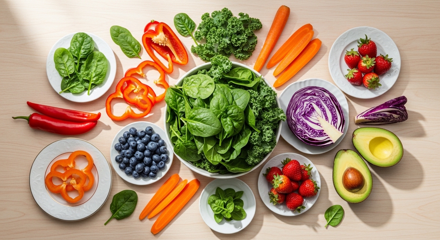 雑穀入りご飯または全粒パン、サバの塩焼きまたは鶏むね肉のソテー(タンパク+オメガ3)、ブロッコリーと赤パプリカのサラダ(ビタミンC+βカロテン)、かぼちゃのヨーグルトサラダ(ビタミンACE+乳酸菌)、デザートにキウイまたは柑橘類(ビタミンC豊富)という組み合わせで、筋肉・骨・肌の材料(タンパク質)、紫外線ダメージに対抗するビタミンACE、腸内環境を整える食物繊維と乳酸菌が一度にとれ、「歩ける体」と「紫外線に負けない肌」の両方を支える”インナーケア”になります。